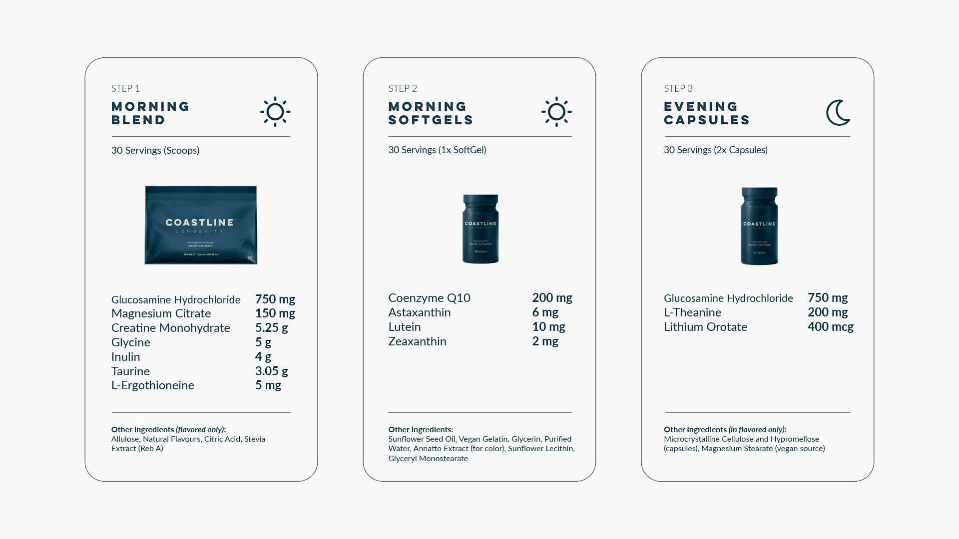 Optimize Your Health From AM to PM. With Coastline Morning Blend, Morning SoftGels, and Evening Capsules, you've got one powerful system designed to optimize your health today and healthspan tomorrow.
